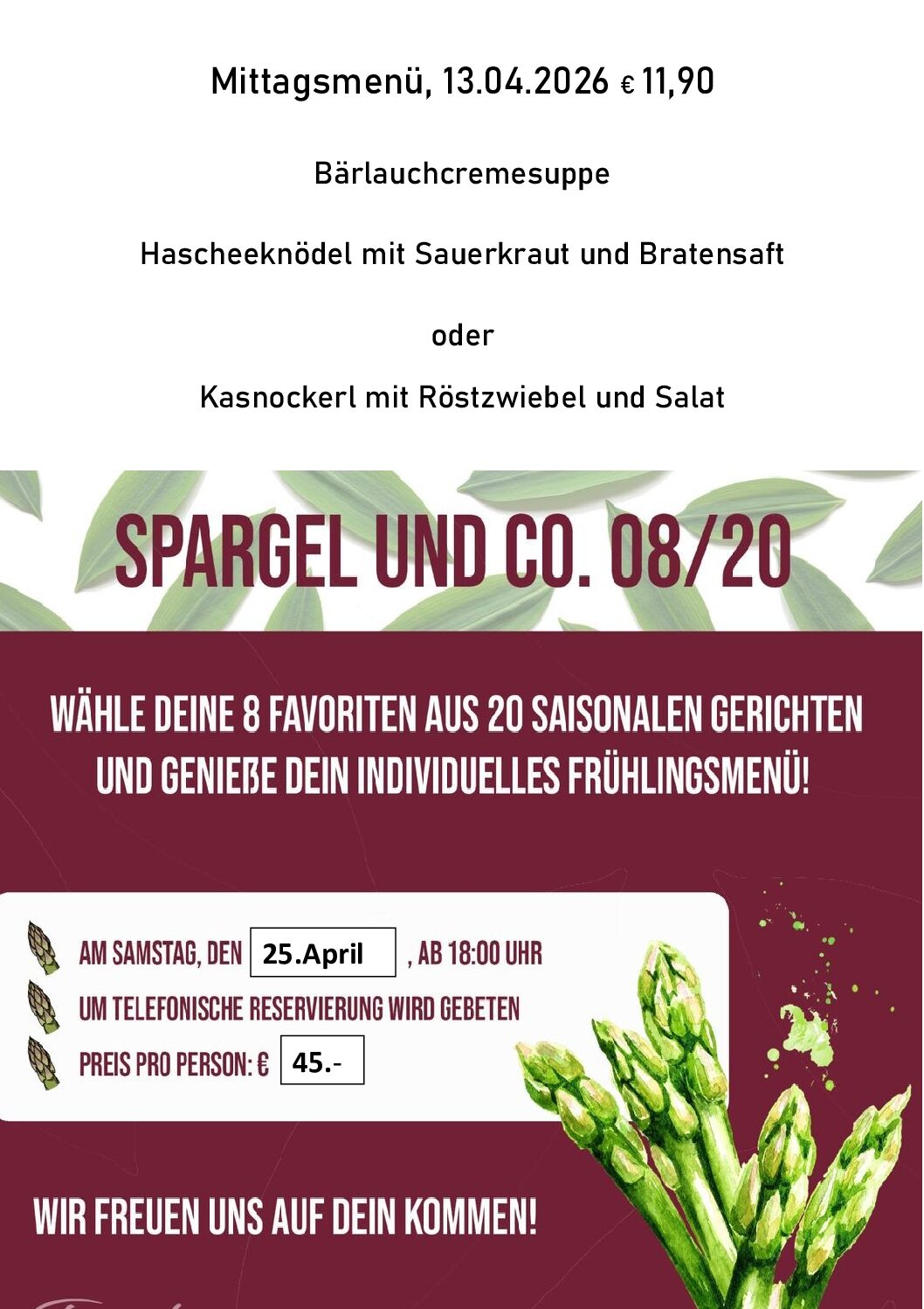 Die Speisenauswahl orientiert sich am saisonalen Angebot und wechselt daher in regelmäßigen Abständen. Baumgartner Bier wird offen ausgeschenkt und eine Vielfalt an Weinen lädt zum Genießen ein. Zudem runden verschiedene Säfte vom Obsthügelland und hausgemachte Limonaden das hauseigene Angebot ab.