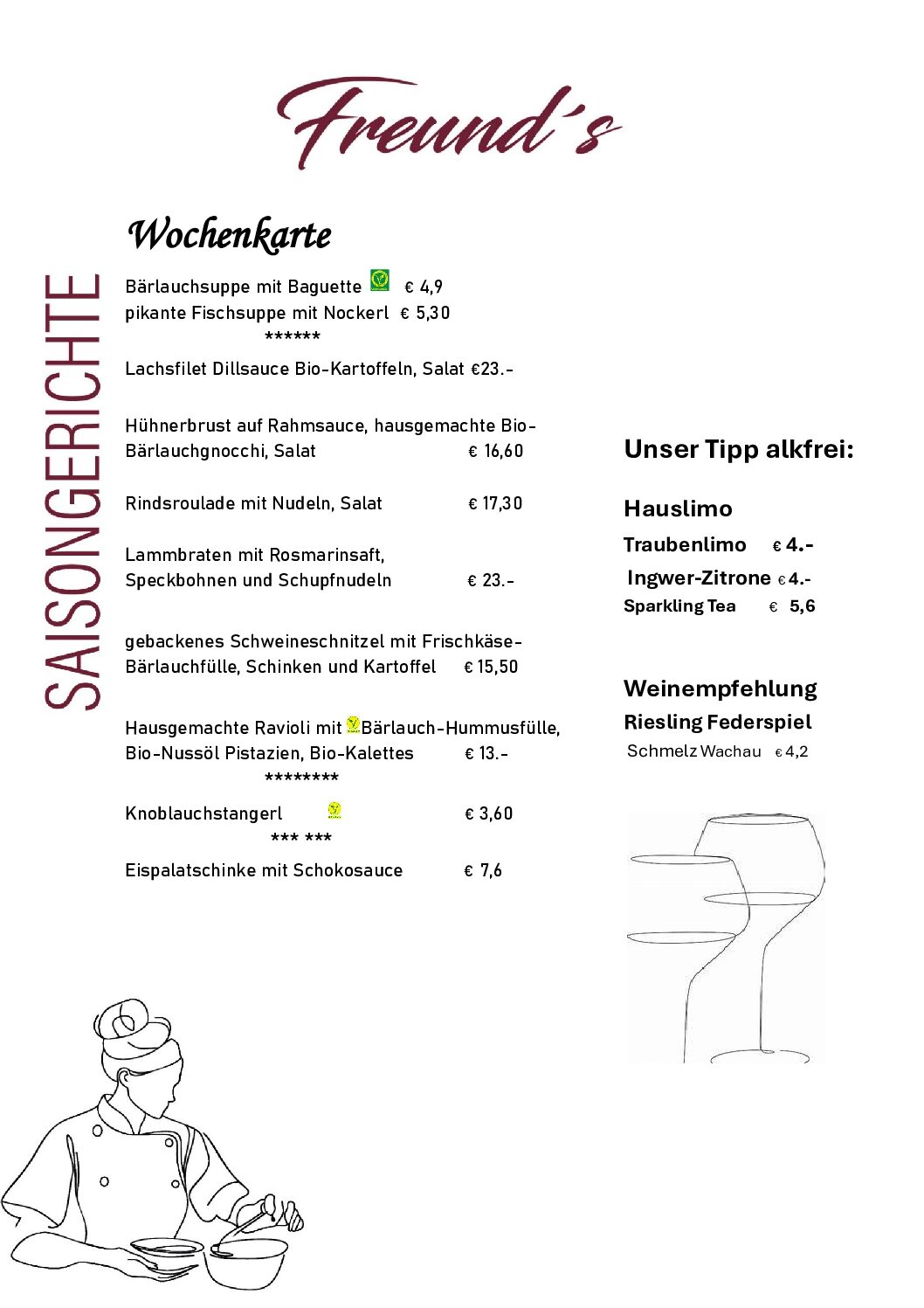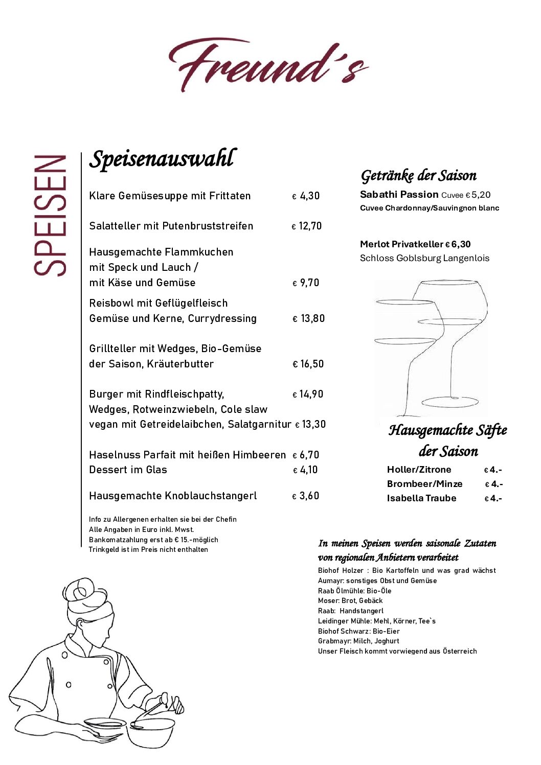 Nach meiner Lehre im Mühltalhof und verschiedenen Stationen in Küche und Service führte ich die Küche im Bezirksaltenheim Eferding, nach knapp 20 Jahren suchte ich eine neue Herausforderung und eröffnete das Freund`s am Stadtplatz. Dort lege ich großen Wert auf saisonale Zutaten von heimischen Betrieben. Bodenständige Hausmannskost und kreative Küche aus aller Welt finden sie auf meiner abwechslungsreichen Karte.